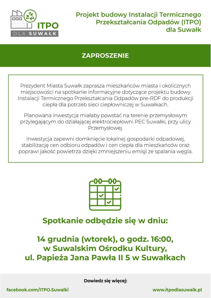14 grudnia br. w Suwalskim Ośrodku Kultury odbędzie się kolejne spotkanie z mieszkańcami Suwałk i okolic dotyczące projektu budowy ITPO dla Suwałk. Podczas spotkania zostaną zaprezentowane najważniejsze wniosku z raportu oddziaływania przedsięwzięcia na środowisko.